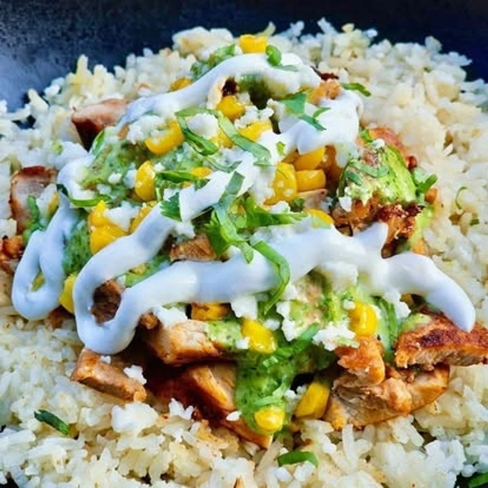 W/ Chopped Chicken Breast, White Rice, Queso Fresco, Fresh Corn, Cream & Cilantro Sauce