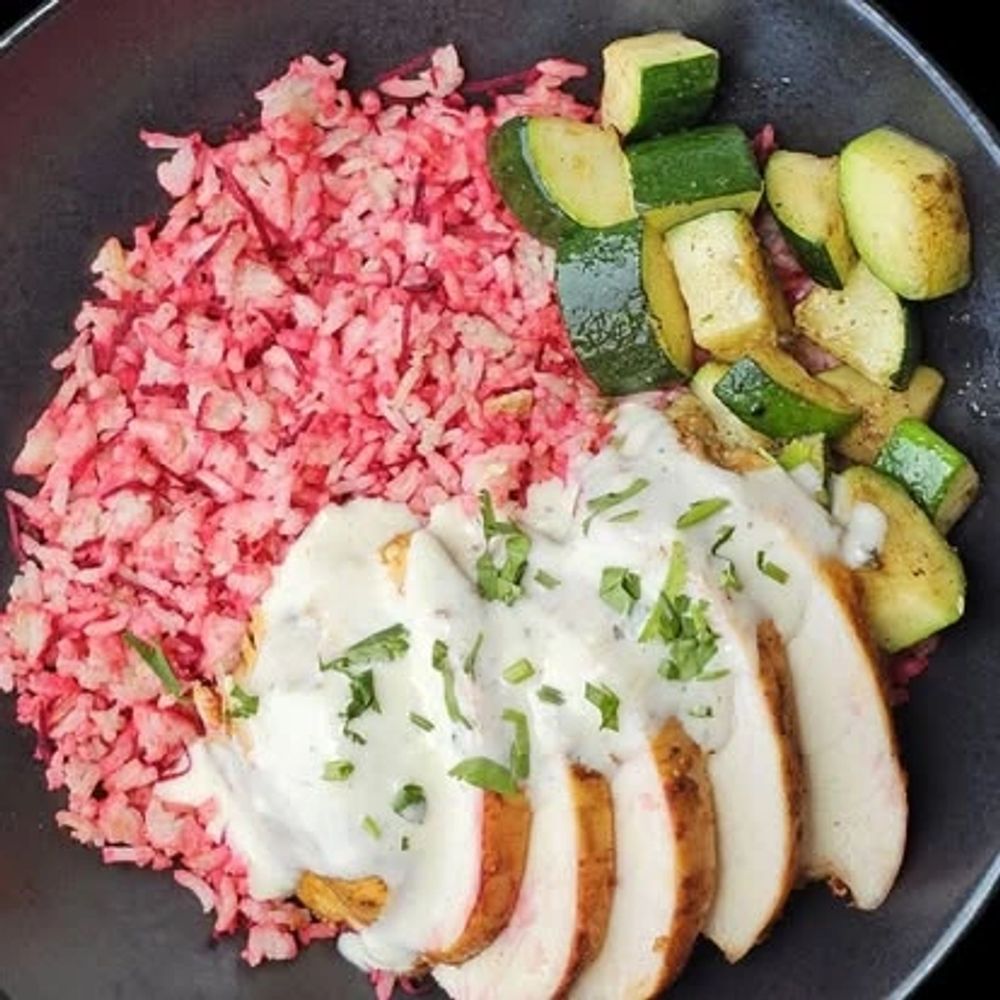 W/ Baked Chicken Breast, Beet Rice, Grilled Zucchini, HouseMade Italian Parmesan Sauce